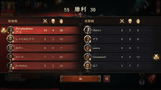 初戦!共鳴5000以上の強豪プレイヤーは、味方にあめく氏、相手にKavaaaash氏と互いのチームに1名ずつという構成。戦力的にも防御側が勝っていたようで、石像殆ど押される事無く55KILLして勝利!